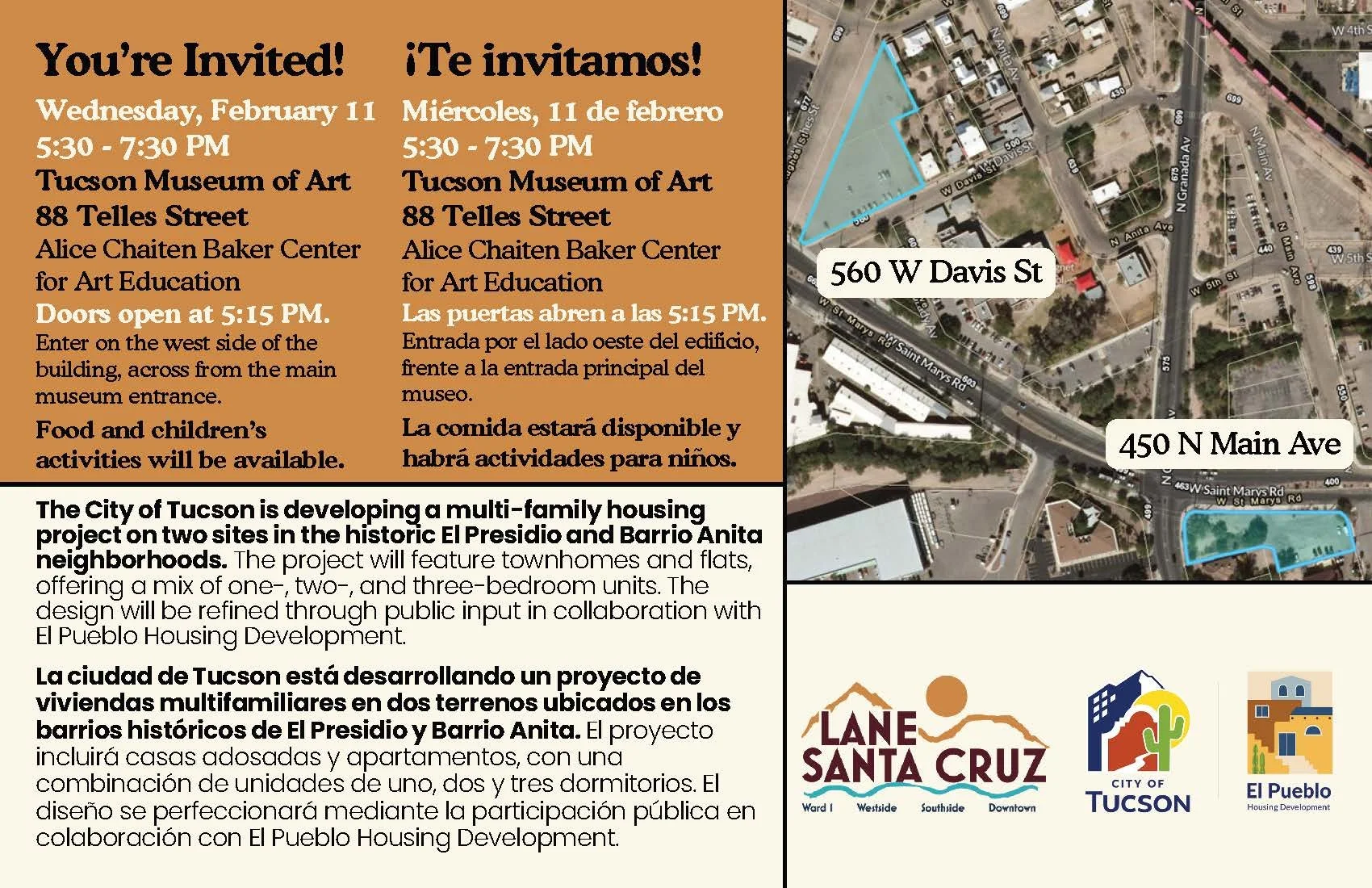 The City of Tucson plans to develop a multi-family housing project on two historic neighborhood parcels: 450 N Main (in El Presidio neighborhood) and 560 W Davis (in Barrio Anita neighborhood). Together, the two sites will provide high-quality, neighborhood-compatible housing that respects the unique character of some of Tucson’s oldest communities.
